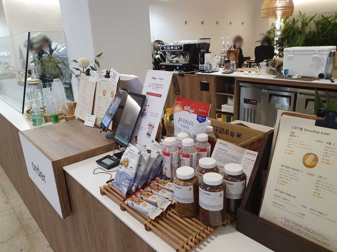 카운터에서 그래놀라와 관련된 여러 상품들을 판매하고 있었어요.