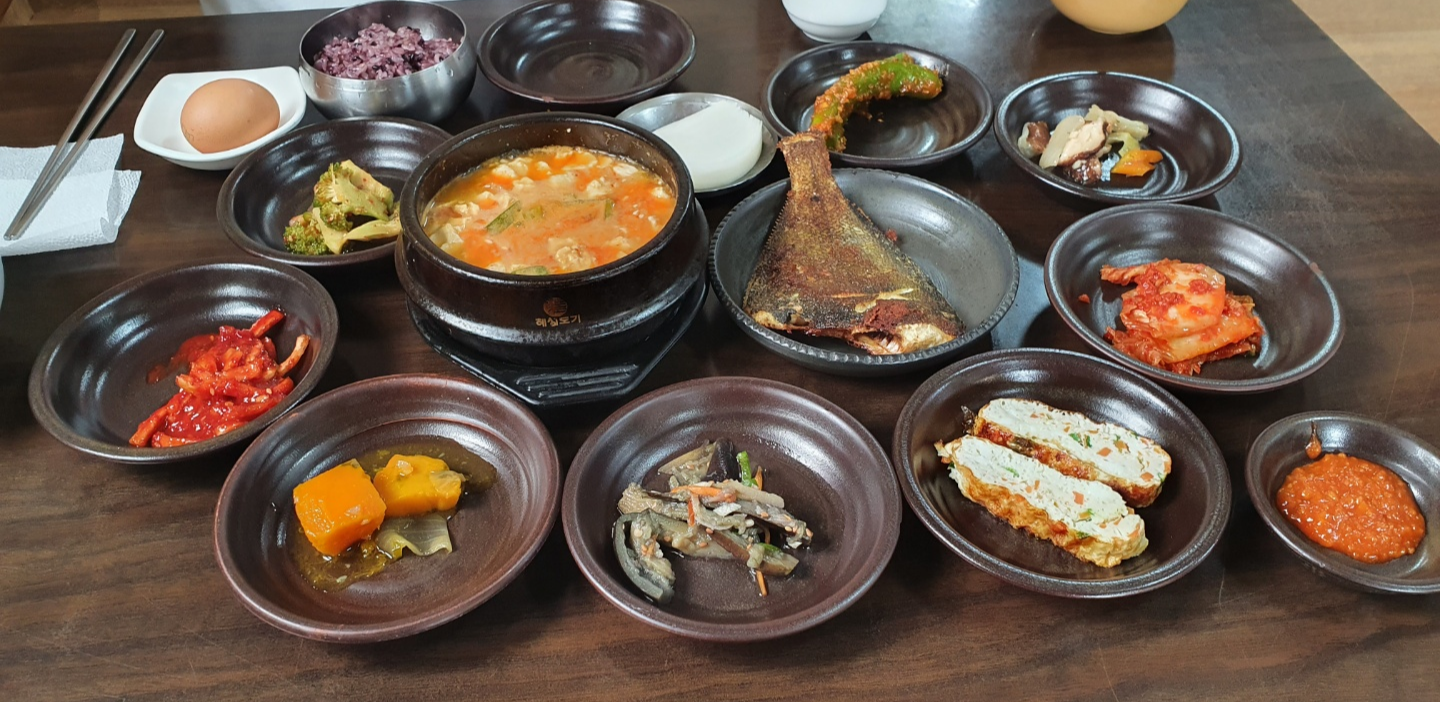 그러고 우리가 시켰던 순두부찌개와 반찬들이 나왔다.